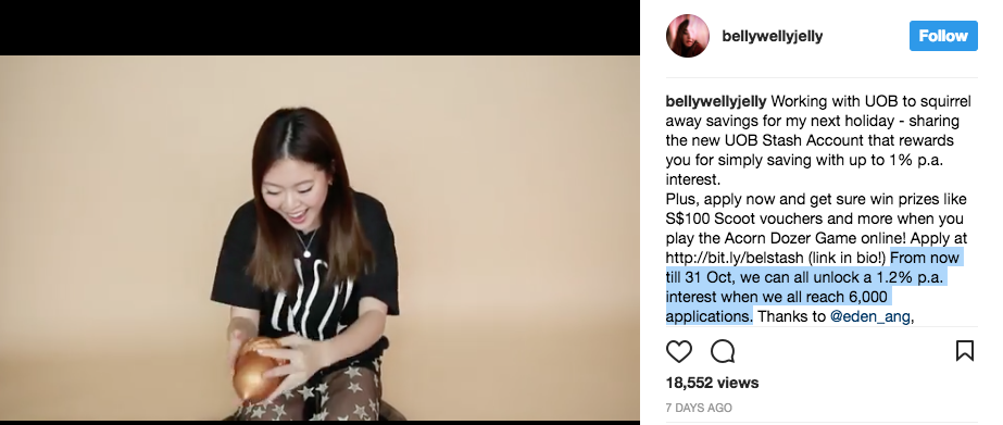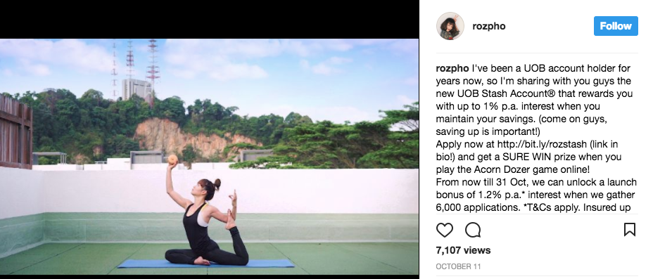 Anyway, I digress. I’m not here to talk about UOB Krisflyer, but about UOB Stash instead. Take a look at one of the campaign posts promoting the account, by one of the same influencers involved in the UOB Krisflyer saga: