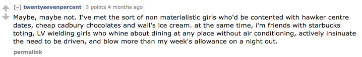 A friend shared this post with me this morning: “Female, 28, Looking for Expensive Boyfriend”. A number of male readers who have emailed me for advice on saving have also lamented that it is easier to save if you are a girl, since the guy has to pay for the date.