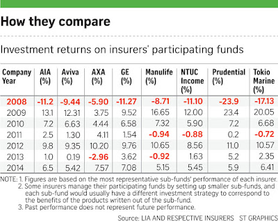 According to LIA’s compilation of life funds’ returns requested by The Sunday Times, insurers Manulife, Prudential, AIA and Tokio Marine have achieved average returns of above 4 per cent per annum over a seven-year period ending 2014.