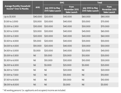 To illustrate, let’s consider a pair of fresh university graduates (Jack & Jill) who are in their second year of work. Jill is a junior designer who earns $1,800 each month, whereas Jack, who works as a HR executive, had a pay raise 2 months ago from $2,500 to $3,000 as he got promoted to a senior executive. Jack’s average monthly income for the last 12 months works out to be $2,583*. Their combined income of $4,383 makes them eligible for $10,000 of AHG and $40,000 of SHG, or a total of $50,000 in grants.