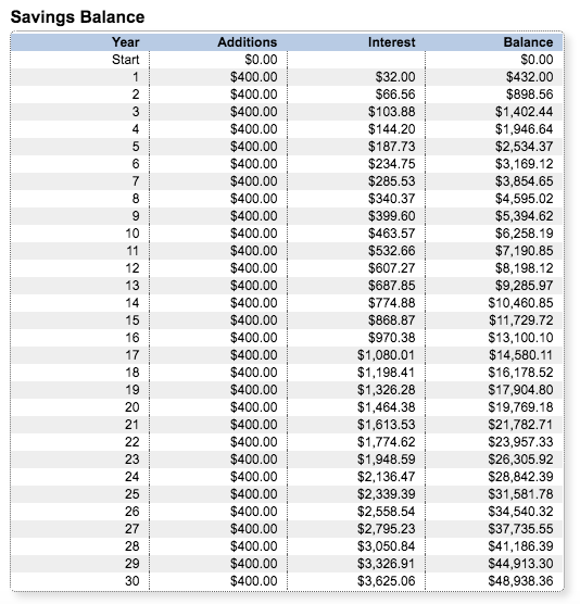 In fact, it would even be okay to say that after 10 years, you effectively receive >$400 from interest earned at 8% growth without any extra deposits.