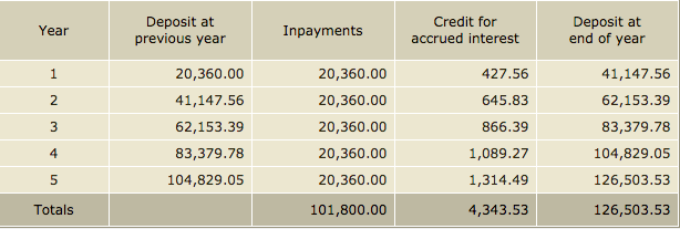 Assuming an annual interest of 1.5%, your savings in 5 years will look somewhat like this: