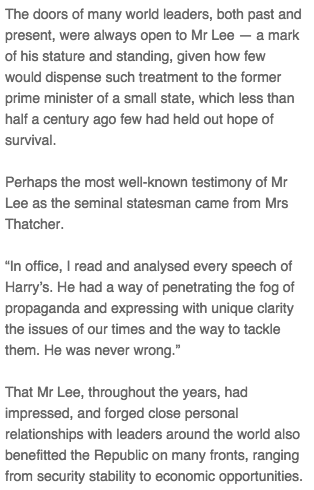 Mr. Lee took efforts to build and maintain close friendships and relations with international leaders abroad. He earned the praise and respect of many. I love this writeup from Today newspaper: