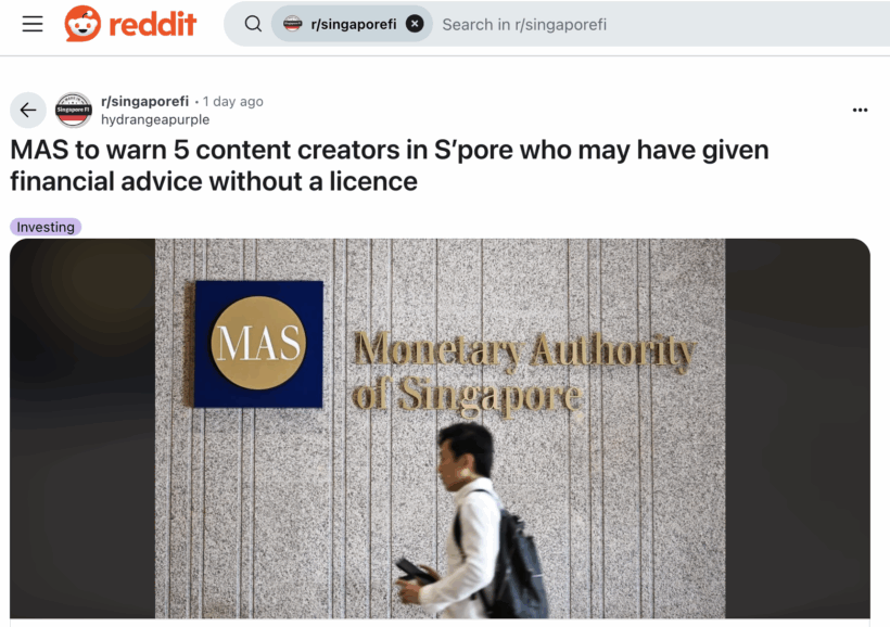 If you look at what MAS’ guidelines on The Licence Lane states, these fall within recommendations to buy specific investment products and tailoring information to an individual’s circumstances. However, it’ll be hard to regulate here, so you should think twice before acting on any advice given to you by someone you do not know and whom you cannot hold accountable for.