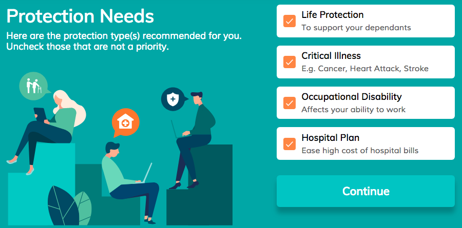 Click on Find Out What I Need to fill in your profile and get a preliminary analysis from their AI robot technology, which employs an algorithm to identify your protection needs and provides recommendations on what type of insurance products you might want to look at getting (as well as giving you the top 2 cheapest quotes).