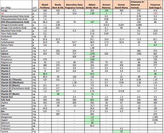 Since my decision to drink the maternity milk was largely due to its nutritional content, I set out to compare across all the different milk brands in order to discern which would be the best (green denotes the best in that nutrient):