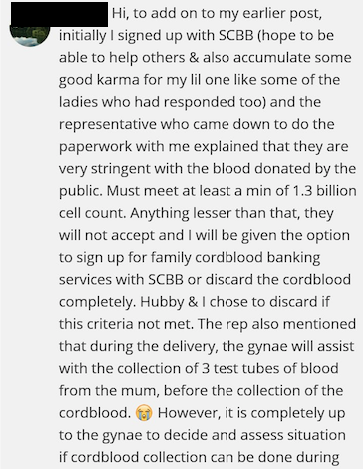 2. If cells are too small for public bank,would storing a smaller numbers of cells be clinically useful? May not be enough anyway and that’s why the cutoff for public banks. –> from what I know and have gleaned during the course of my research and speaking with various professionals, including those in the medical sector and private cord banks, that's because public banks have stricter requirements when it comes to using donated samples for someone else. I would also reckon you'll need more because a portion needs to be tested for recipient suitability as well, something which you don't need if you're banking for your own child since it is their own DNA in those cells. You can think of it in the same vein as blood donations – when u donate to family vs to stranger, which has stricter requirements?