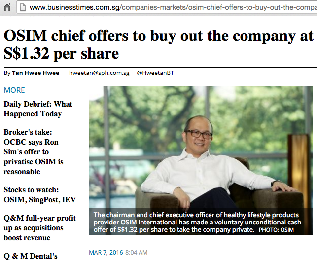 Many of us were keeping an eye on OSIM when it was announced that there would be a trading halt to OSIM shares on the stock market since last Wednesday. Today, CEO Ron Sim announced a takeover offer in a bid to privatize the company. For investors who own OSIM shares, could this be good or bad news?