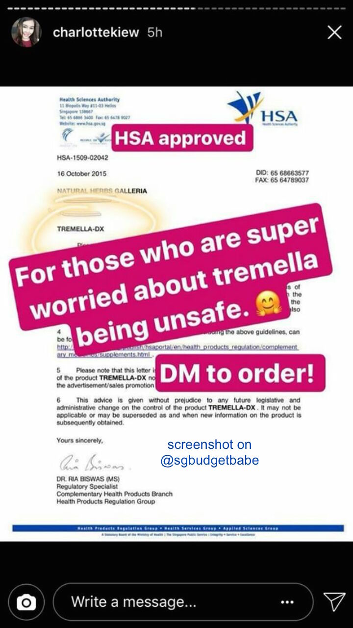 At least one reader of hers believed Charlotte’s claims that it was indeed HSA-approved and thus absolutely safe for consumption and sale in Singapore, but eventually found out it was false (and provided me with the screenshots above and below for the purpose of this piece to warn people).