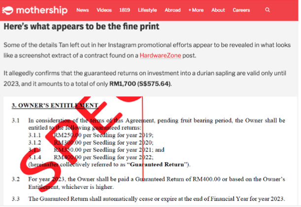 A few days later, notably after the story made even more waves after being republished on Dollars and Sense, as well as MustShareNews, Rachell Tan took down all evidence of her involvement in the durian investment scheme on her Instagram, only leaving one photo of some men with the purported seedlings. Both the sites that reproduced the story as well as screenshots of the contract did proper source crediting back to me, even for MustShareNews, who did a slightly different spin on it.
