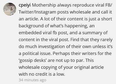 Let’s give Mothership the benefit of the doubt: perhaps they really did take from her page, except that they had to go through so many editorial QC processes that it took a long while before the article could be published.
