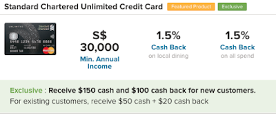- Standard Chartered’s Unlimited Cashback Card: get $150 cash upfront if you’re a new customer, $50 if you’re an existing SC user